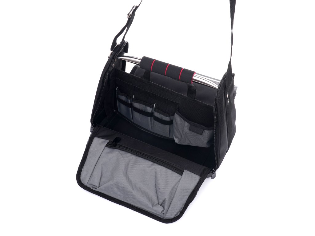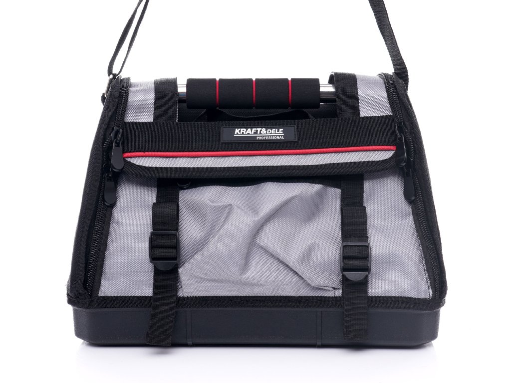 Szerszámtáska, szerelő a Kraft&Dele márka ideális rendszerező minden szakember számára (villanyszerelők, vízszerelők, burkolók stb.). A merev alja kompozit anyaggal van borítva, ami biztosítja a tartósságot, és a belső és külső zsebek rendet adnak és gyors hozzáférést biztosítanak a szükséges szerszámokhoz.