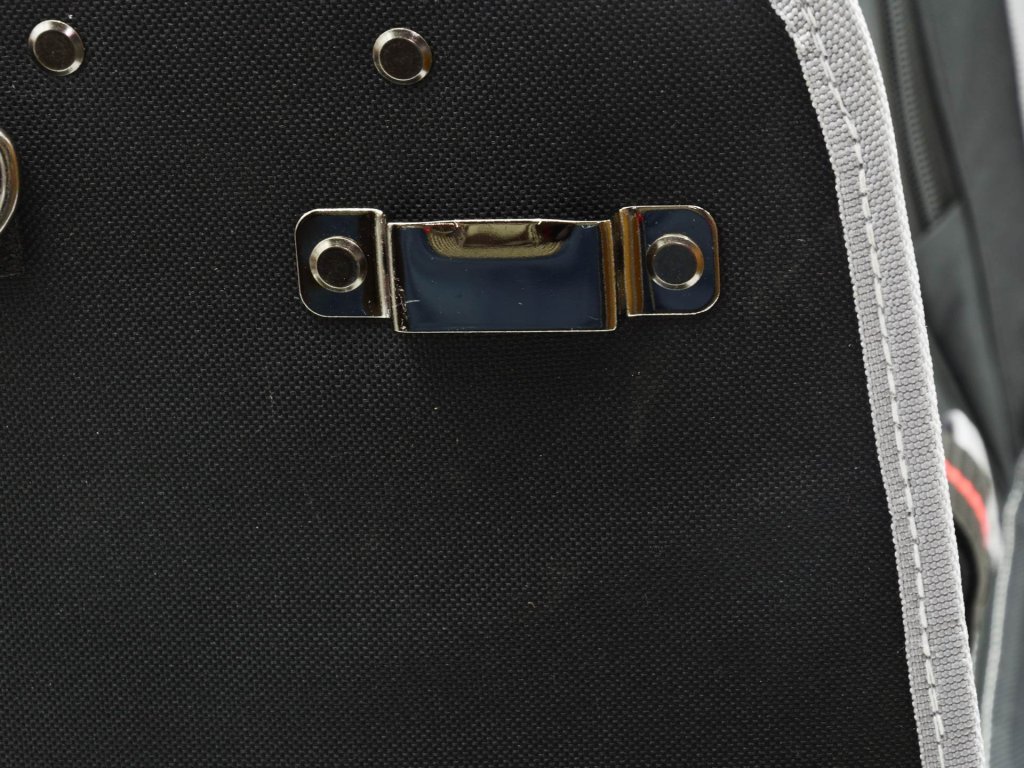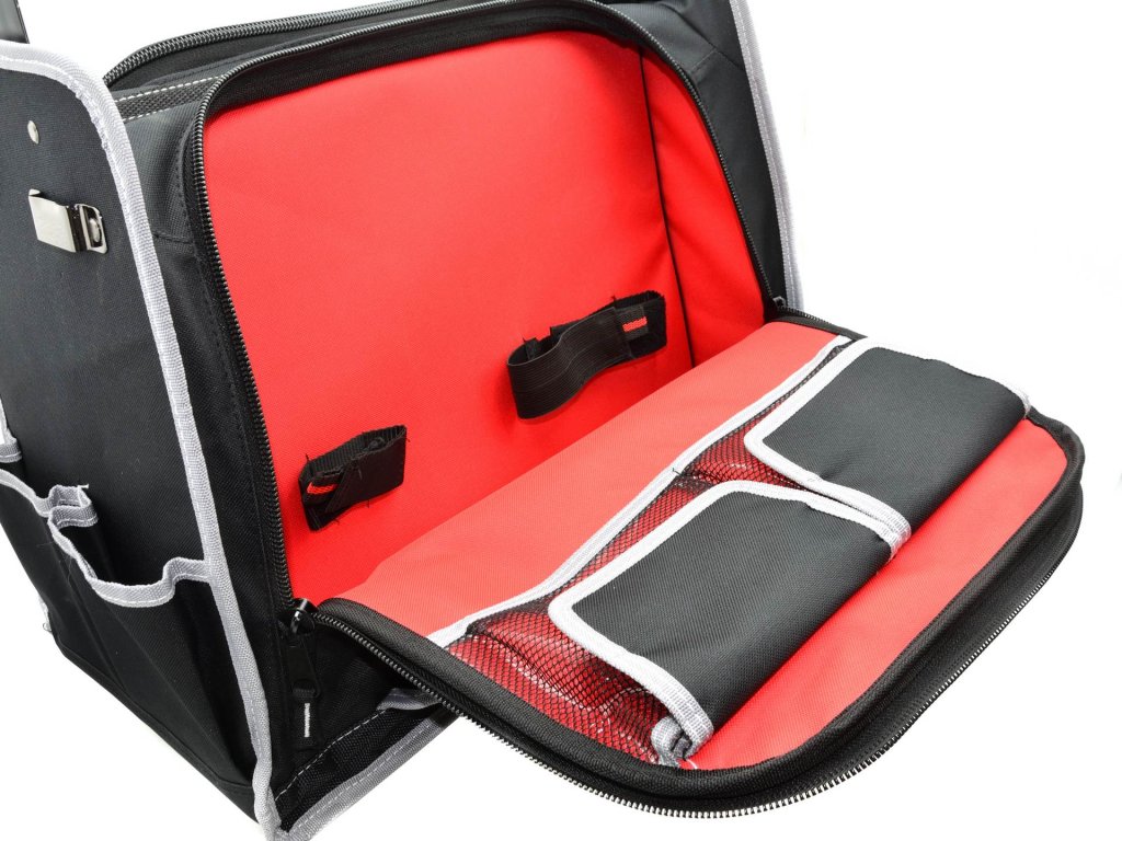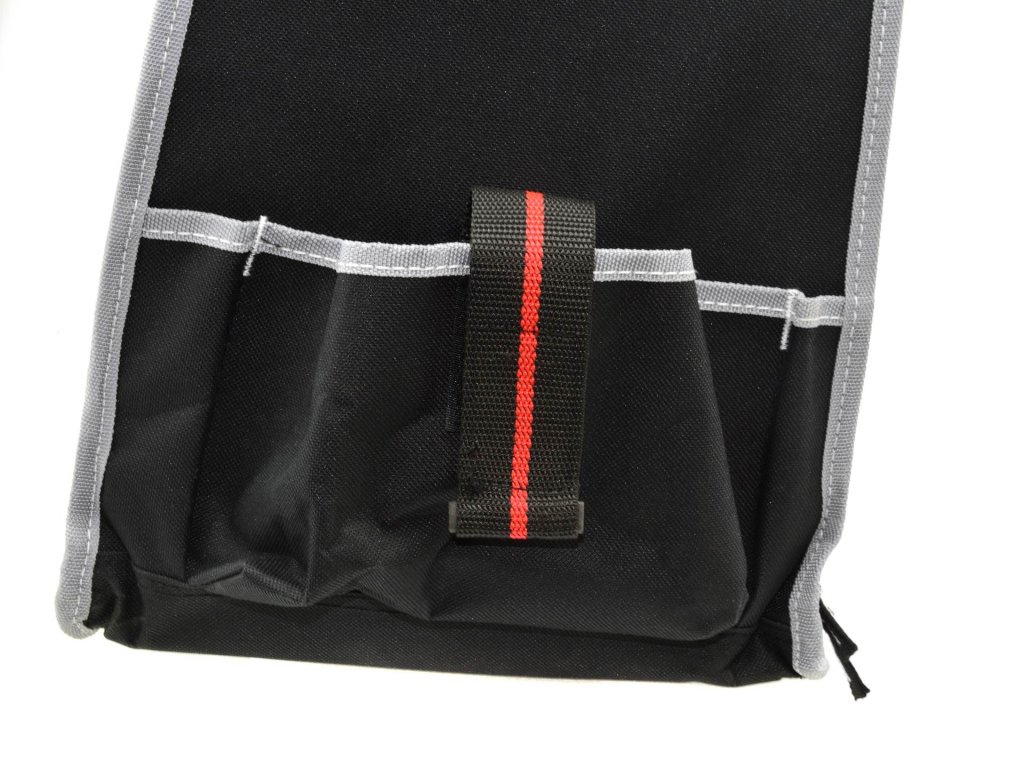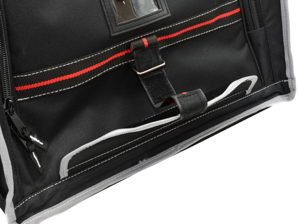 - A táska elülső oldalán zipzárral zárható dokumentumtartó zseb található, valamint 6 zseb, amelyek közül az egyik tépőzárral záródik. Emellett klipsz és karabíner a szerszámok számára.