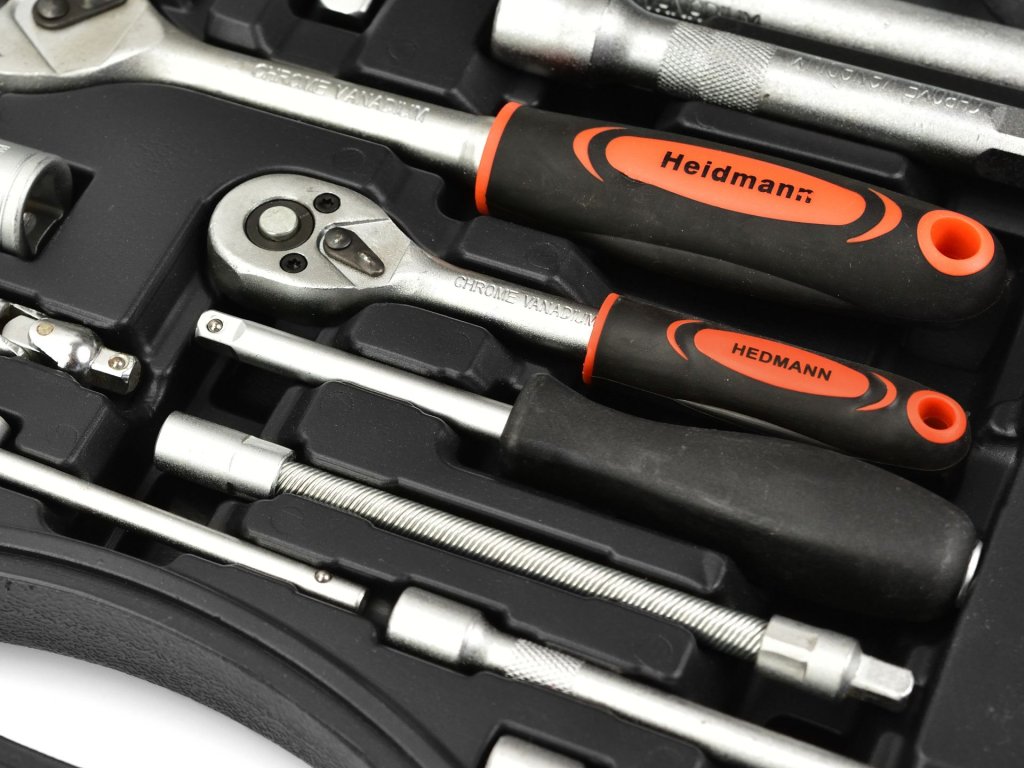 A készlet tartalmaz két ratchet-et (1/2" és 1/4") 24 foggal és ergonomikus fogantyúval a kényelmes és hatékony használat érdekében. A csomag széles választékot tartalmaz a tartozékokból (hosszú és standard) 1/2" és 1/4" méretben, valamint bit készletet.
