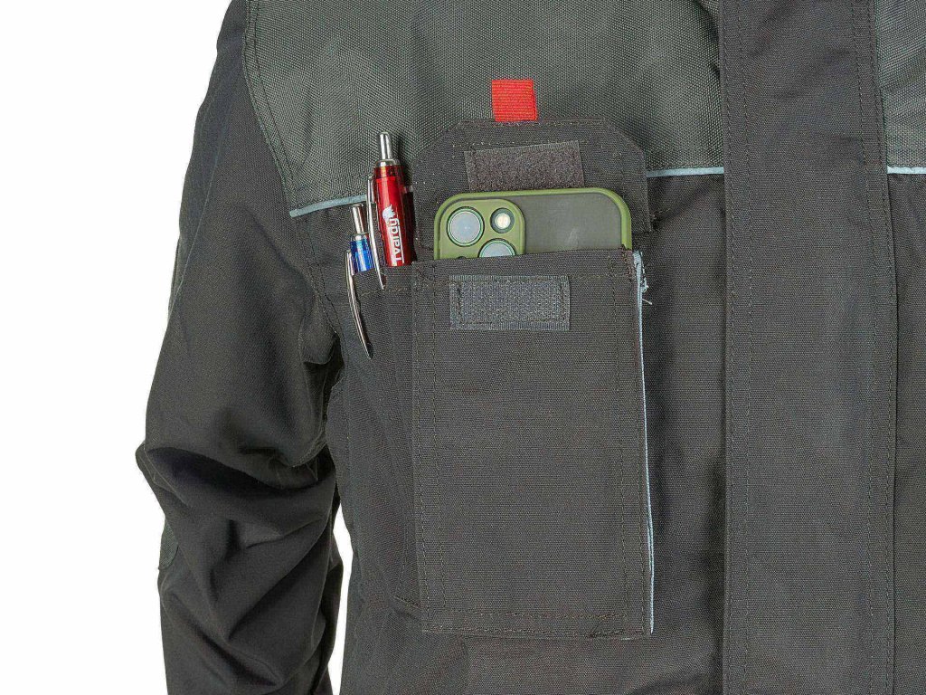 A kabát összesen 7 zsebbel rendelkezik, ebből 4 zsebében tépőzár található. Ezen kívül tartalmaz egy okostelefon zsebet és egy toll- vagy ceruzazsebet. Praktikus cipzárral záródik, és az alja könnyen állítható gombokkal.