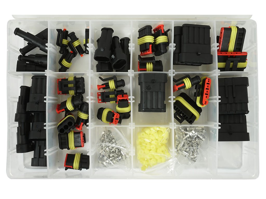 A VERKE hermetikus elektromos csatlakozók készlet 424 db 6 különböző méretben érkezik, amelyek a leggyakoribb elektromos vezetékek átmérőihez alkalmasak. Az autóiparban használják, például érzékelők és berendezések csatlakoztatására az autókban. Garantálják a nagyon jó szigetelést és tömítettséget.