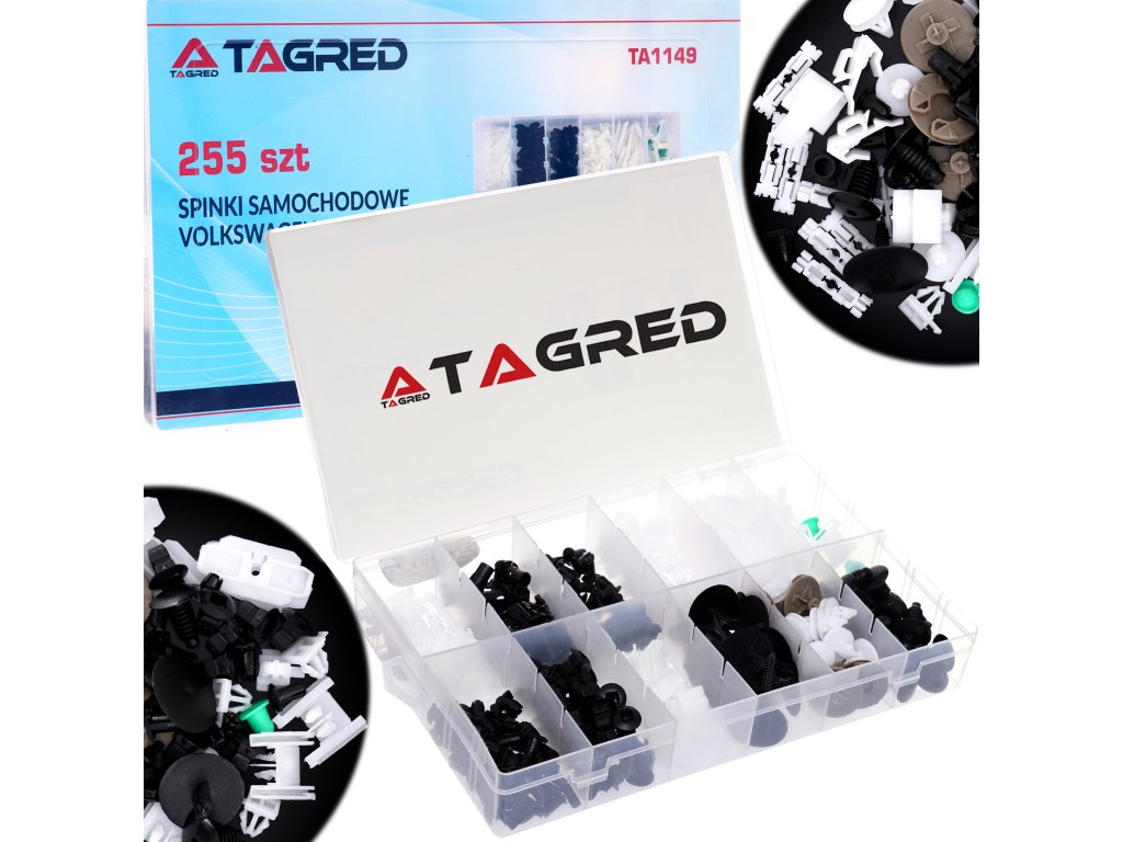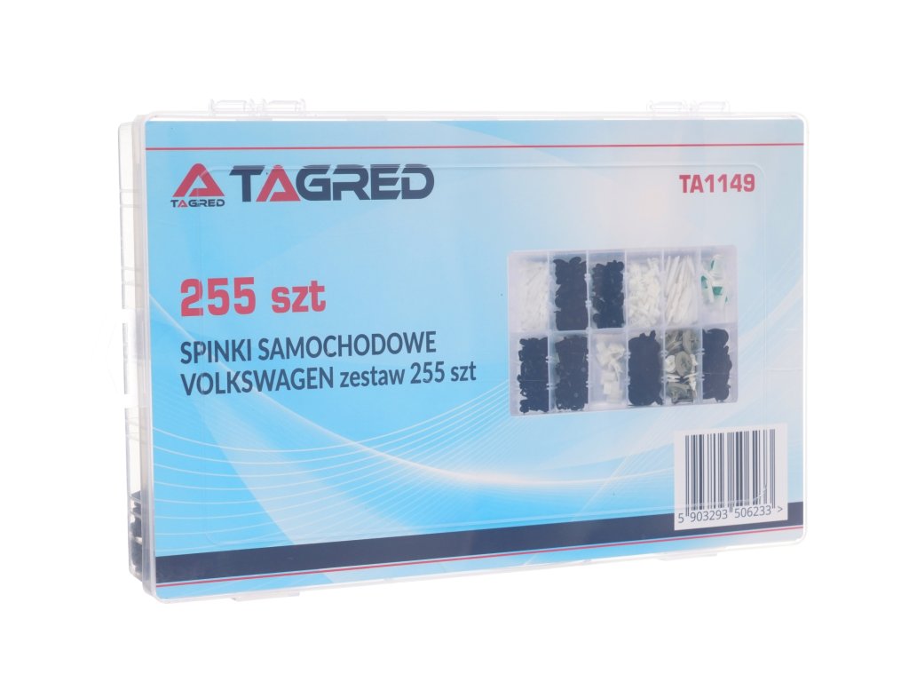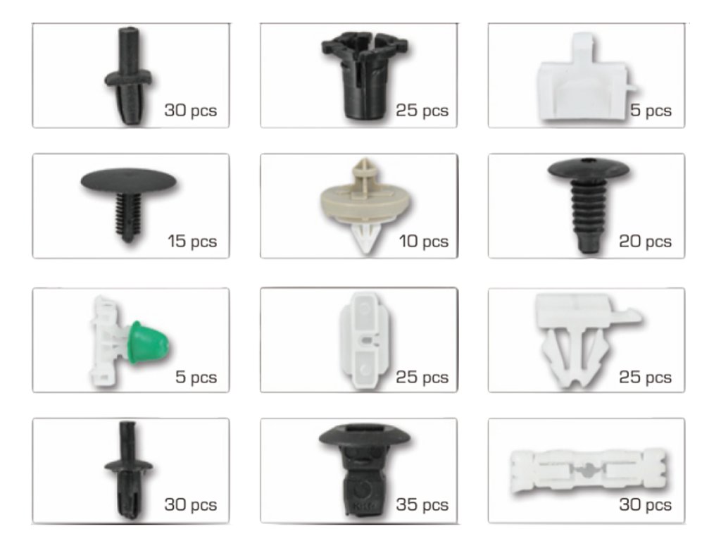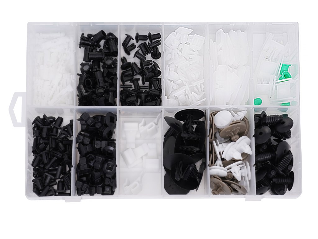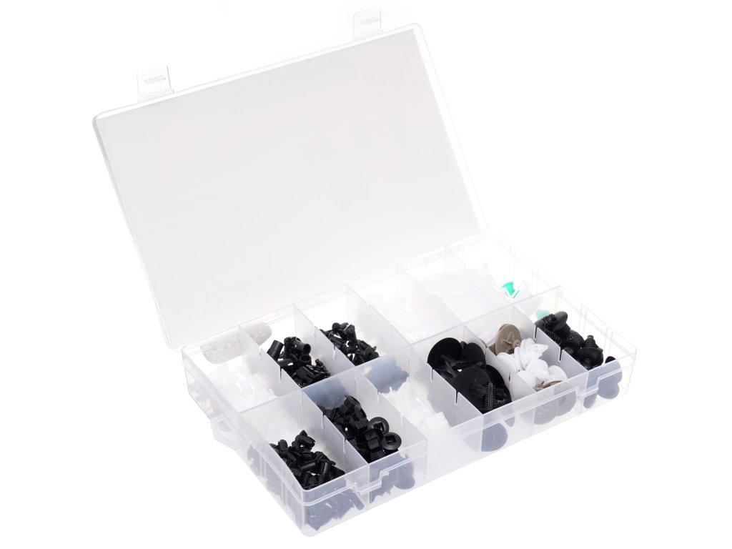 Volkswagen autós rögzítőkészlet 12 különböző típusú rögzítőt tartalmaz, összesen 255 db mennyiségben. Minden rögzítő gondosan elhelyezve egy praktikus dobozban található, kényelmes rekeszekkel a könnyű hozzáférés és szervezettség érdekében.